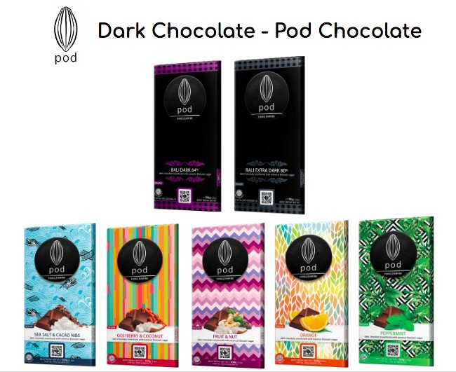 Dark Chocolate Series – Pod Chocolate adalah cokelat hitam asli dari kokoa Bali, terdapat pilihan 64% dan 80%. Juga memiliki pilihan berbagai rasa yang semua terbuat dari bahan organik dan nabati dari petani lokal di Bali.