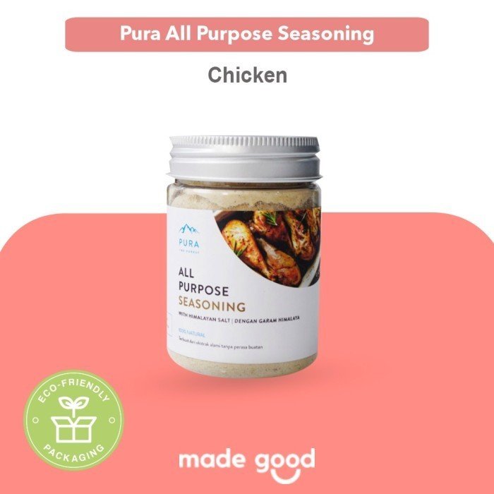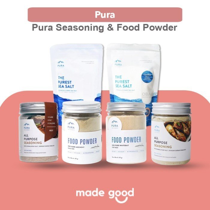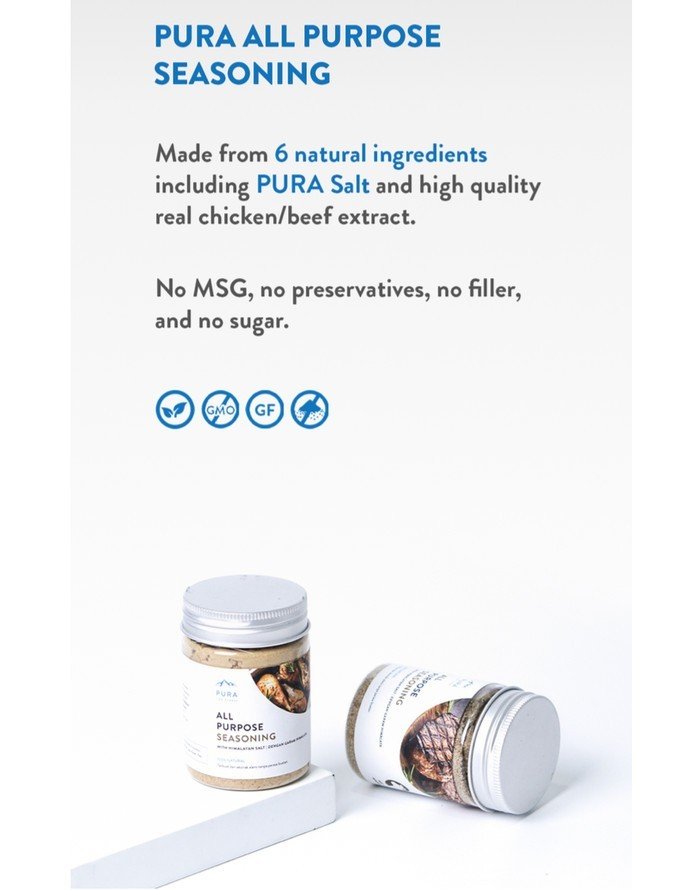 2. Pura All Purpose Seasoning, Pura All Purpose Seasoning adalah bumbu perasa alami yang tanpa gula, 100% natural dan tanpa MSG. Terbuat dari daging asli dan Pura Himalayan Salt. Gluten Free and GMO dalam proses pembuatan, dengan sertifikasi 100% Halal dan ISO 22000
