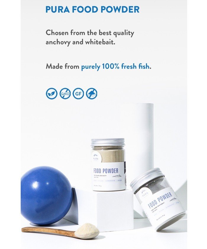 3. Pura Food Powder, Pura Food Powder terbuat dari 100% ikan teri segar, alami dan natural bebas pemutih / pengawet. Diproduksi tanpa gula dan garam, non GMO, bebas gluten. Seluruh kandungannya 100% pure whitebait/anchovy, yang kaya akan DHA, omega-3, protein dan kalsium.